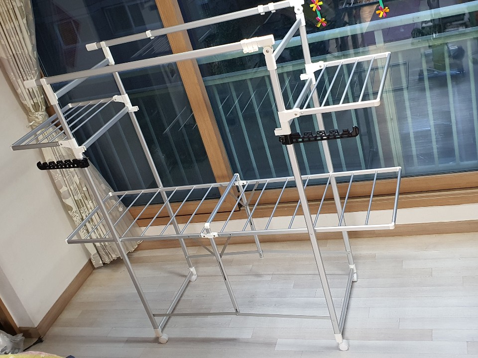 제품을 조립하자마자 사용을 시작했구요. 한번 빨래하면 양이 많아서 웬만한 건조대는 빨래 무게를 견디기가 힘들정도인데, 요 제품은 제가 손으로 힘껏 눌러보고 해도 끄떡 안할 정도로 튼튼해서 안심이 되더라구요. 옷을 잔뜩 널고 위에 이불보 같은 큰 빨래도 같이 널어도 무리가 없네요.