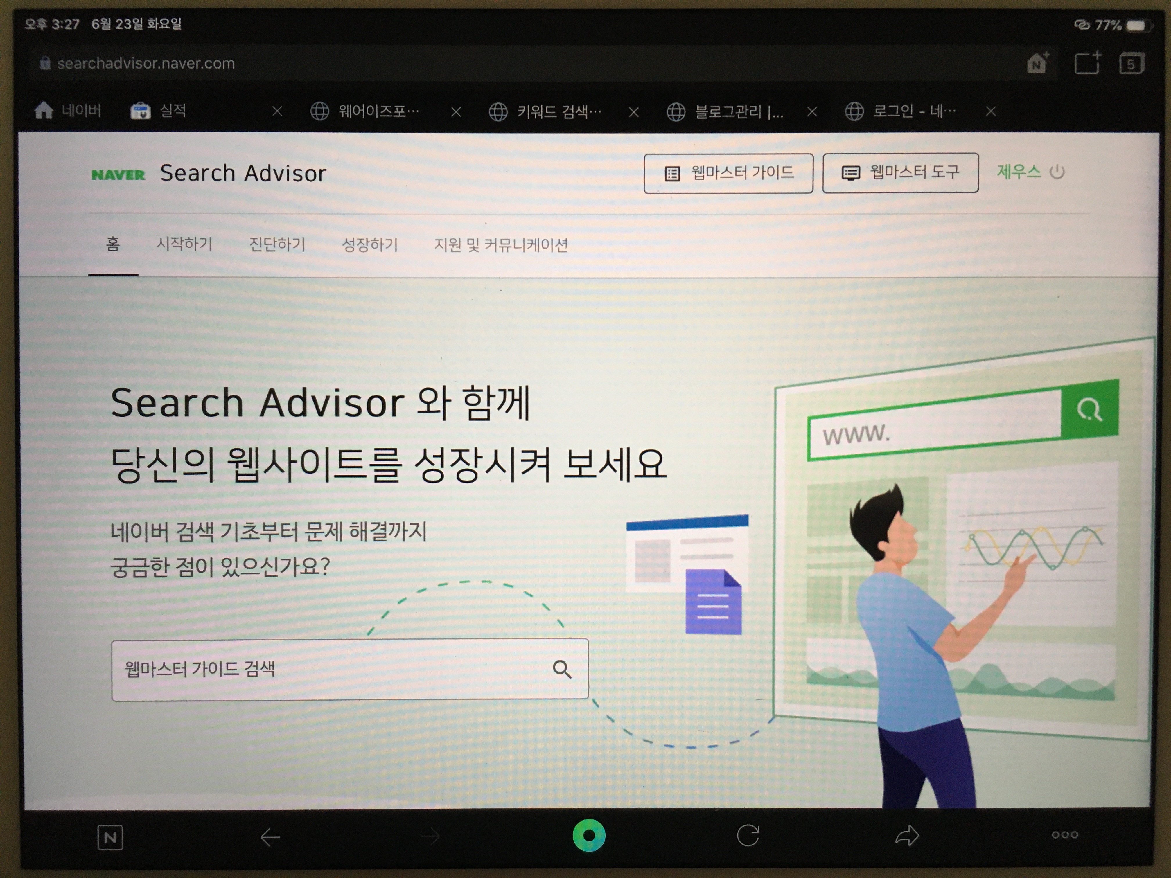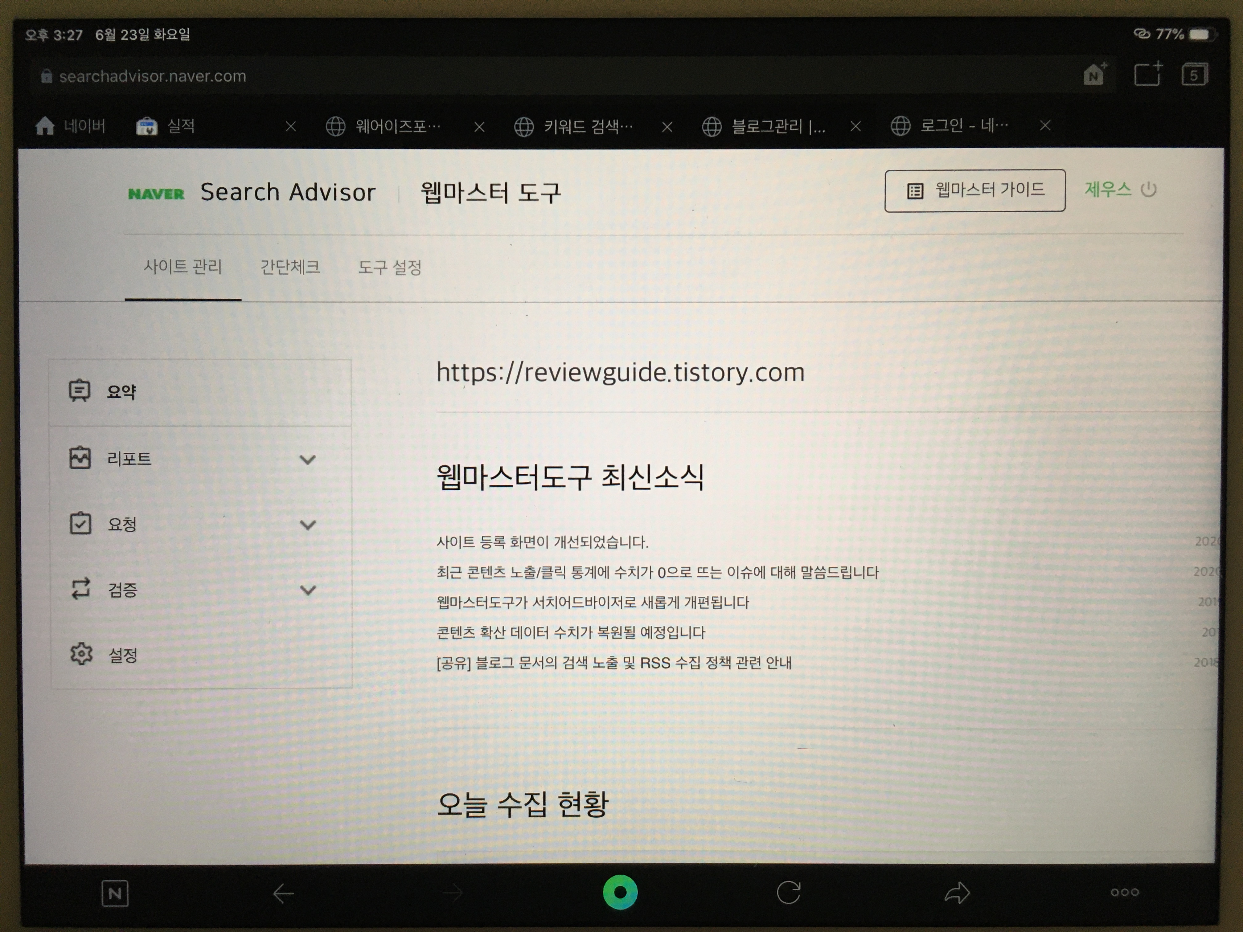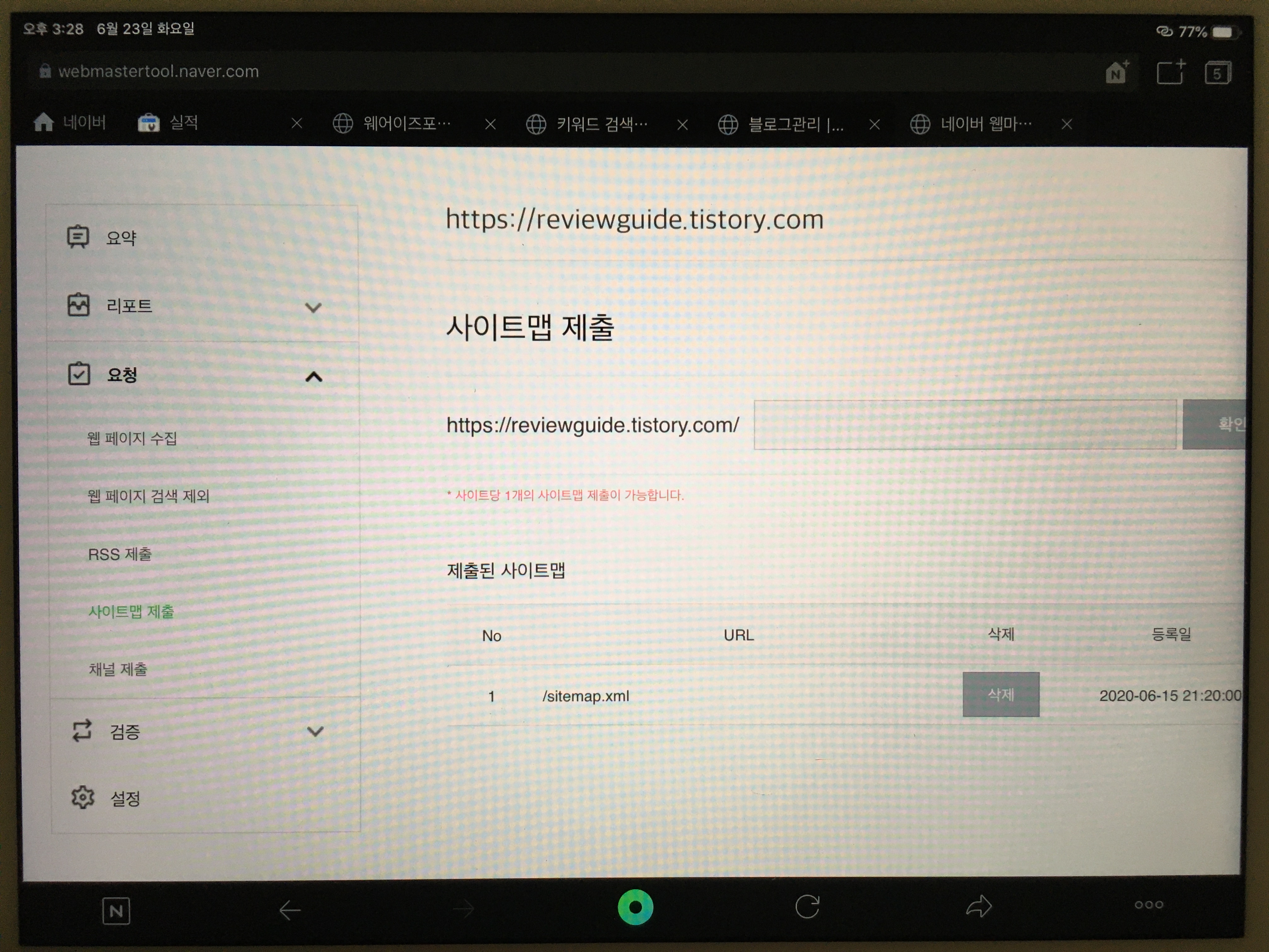 첫 번째, 네이버의 경우 네이버 웹 마스터 도구에 들어가서 로그인 상태에서 웹 마스터 도구 클릭 변경할 자신의 티스토리 목록을 클릭 후 왼쪽 메뉴 요청-사이트맵 제출을 누른 후 신규로 등록하시는 분은 sitemap.xml을 빈칸에 입력만 하면 됩니다. 기존에 등록되었던 맵을 삭제한 후에 진행하세요. 몇 분 지나지 않아서 바로 적용됩니다.
