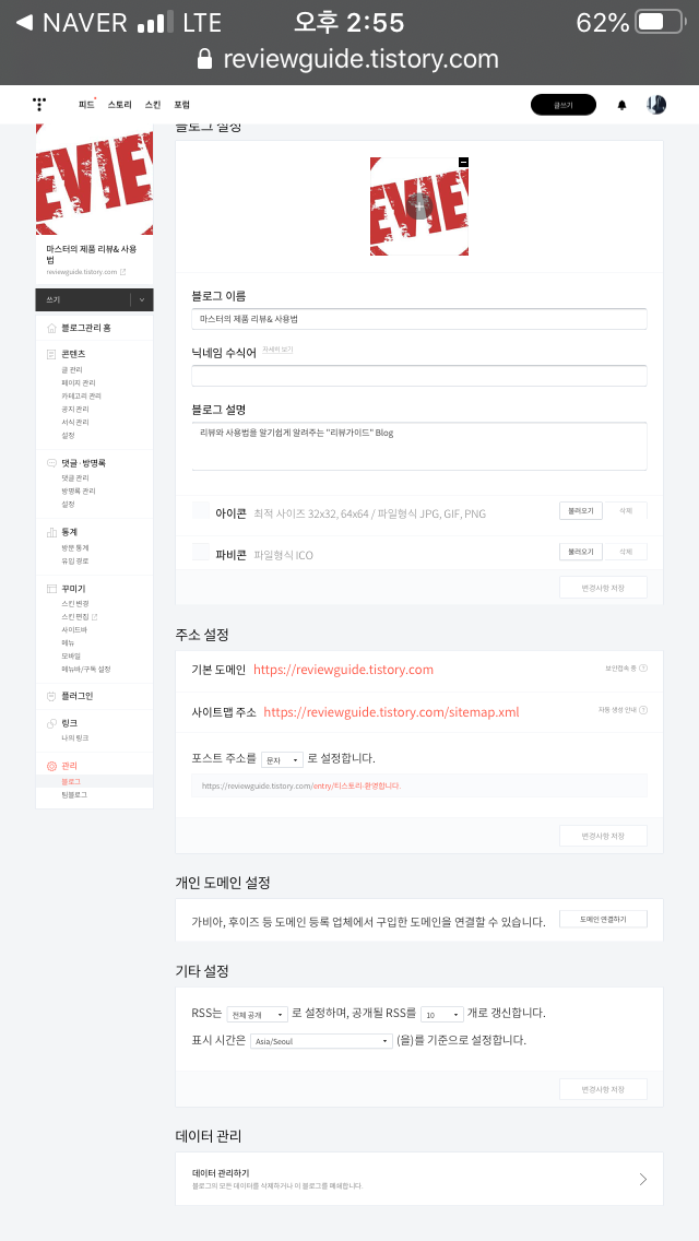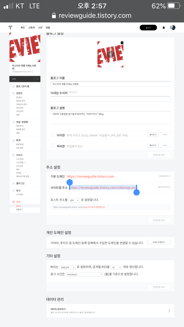 자신의 티스토리 관리자 페이지로 이동합니다. 블로그 클릭-주소 설정-사이트 맵 주소를 보면 자동으로 생성된 주소를 볼 수 있습니다.