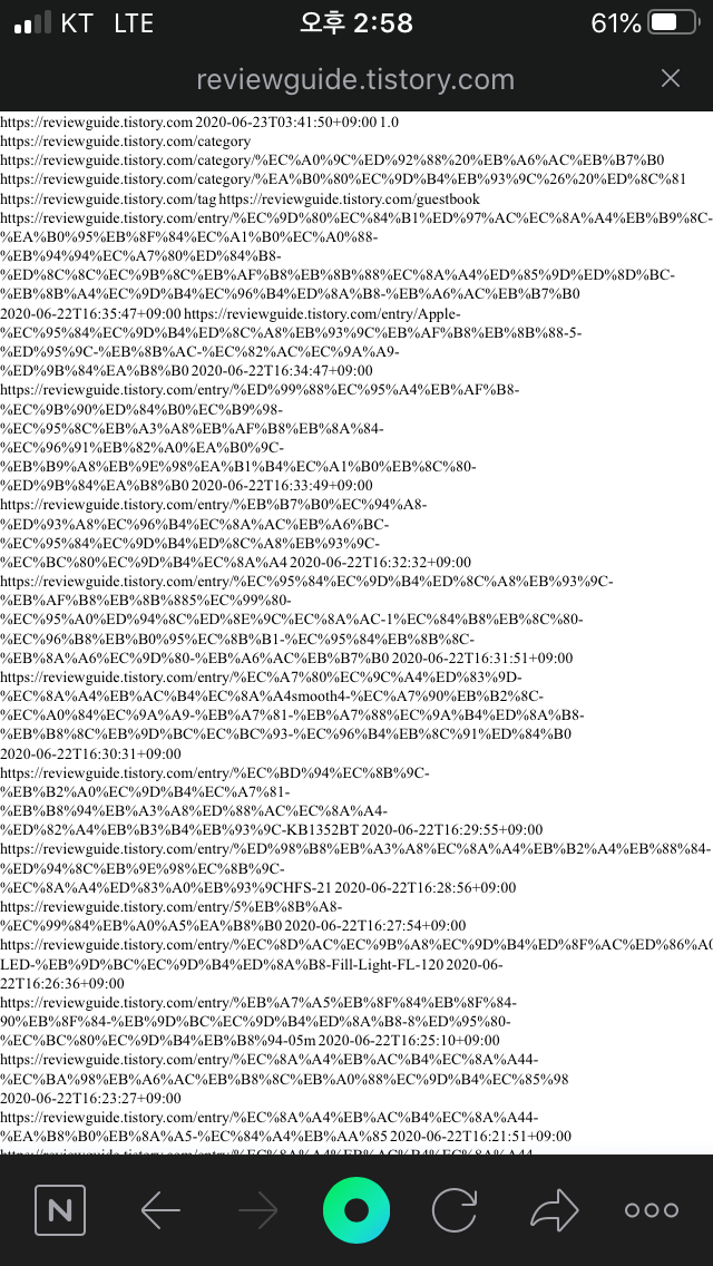 자신의 사이트 맵 주소를 복사해서 새 창에서 열어보면 제대로 생성되었는지 알 수 있습니다. 상단 부분이 자신의 메뉴 관련 사이트 맵이고 하단 부분이 자신의 게시글 관련 사이트 맵입니다. 이 사이트 맵을 통해서 포털 사이트 검색 로봇이 자신의 글을 수집하는데 용이하게 만들어 줍니다.