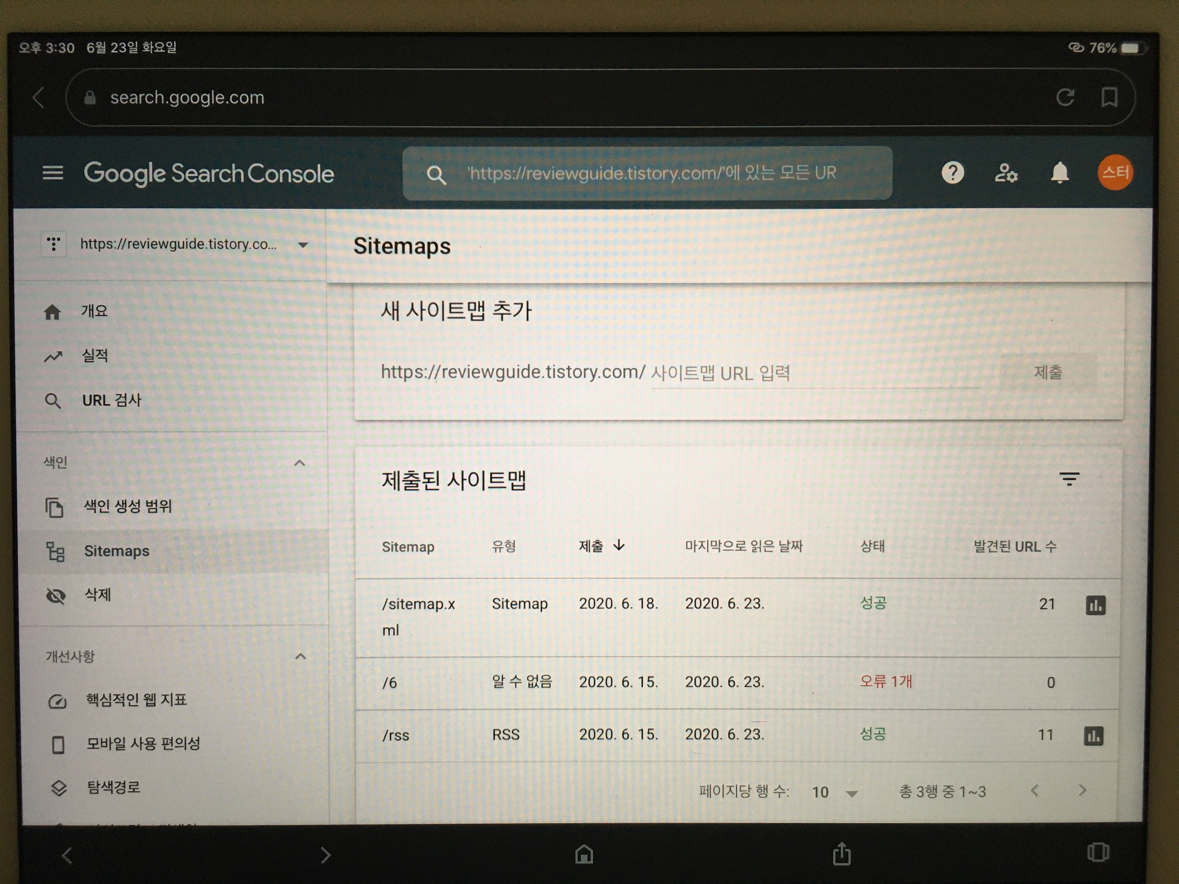 두번째, 구글 서치 콘솔의 경우 왼쪽 상단 메뉴에 자신의 티스토리 블로그 클릭하여 이동 후 왼쪽의 sitemaps 클릭합니다. 신규로 등록하실 분은 네이버와 마찬가지로 sitemap.xml을 입력만 하면 됩니다. 이미 제출된 사이트 맵이 있는 경우 제출된 사이트맵 클릭 후 오른쪽 상단 점 세 개 클릭한 후에 사이트맵 삭제를 클릭해 줍니다.
